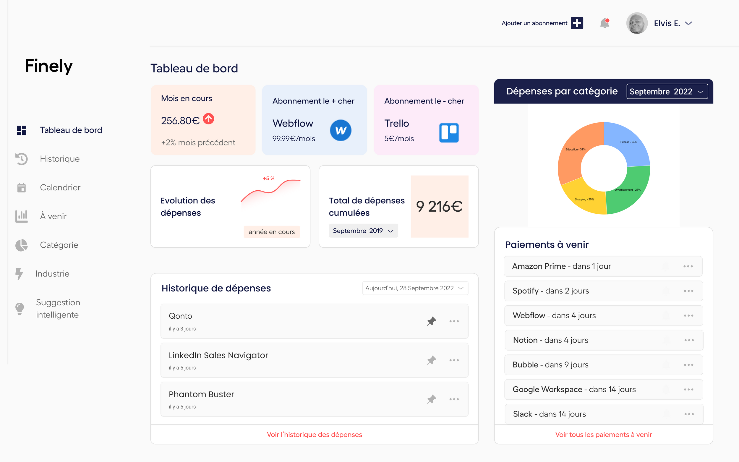 Fini les Google Sheets ! Enfin, un tableau de bord puissant pour gérer tous vos abonnements et vos paiements récurrents. Finely vous montre où vous dépensez le plus et comment vous améliorer.